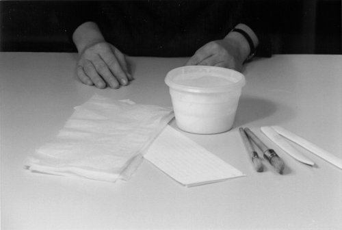 Assemble the following: polyvinyl acetate adhesive (PVA) in a low container, a glue brush, waxed paper, wide strips of scrap paper, and a bone folder. A book press and metal edged boards (or appropriate substitutes) will also be needed.